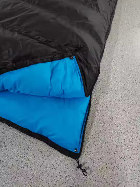 Design Features: The 2 Foot Adventures quilt seamlessly combines the best aspects of a traditional sleeping bag and the freedom of a quilt. The sewn foot-box and full-length zipper, extending from the knee to the top, make it adaptable to varying conditions. The top section features a snap and drawstring for maximum flexibility – leave it unzipped and snapped on warm nights, or zip up and cinch the top for added warmth on colder evenings.